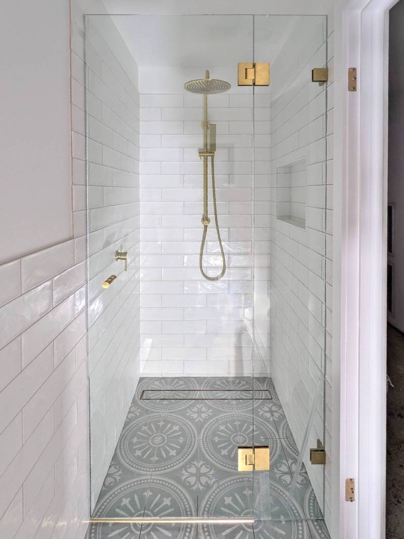 Wall-to-wall frameless shower screen with brushed gold hardware