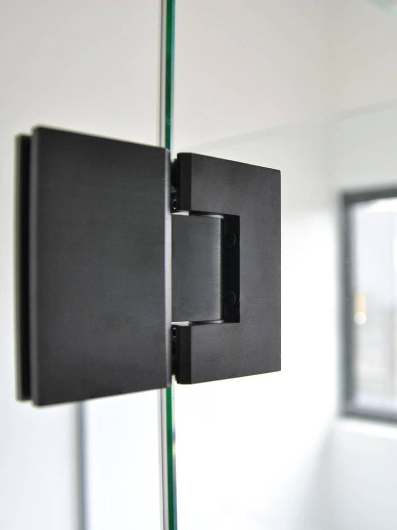 A close of of matt black shower screen hinge