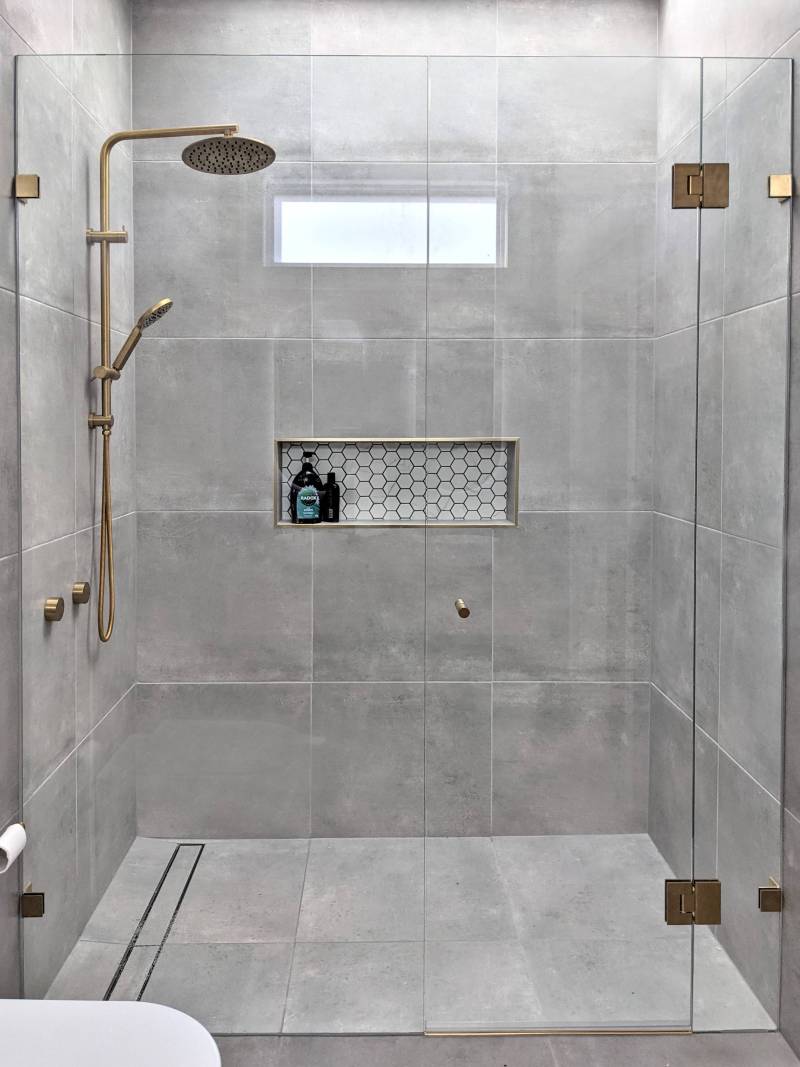 Frameless shower screen in a grey bathroom